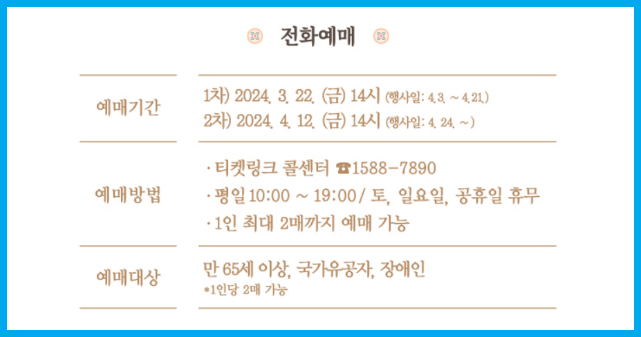 예매는 온라인 예매, 전화예매로 진행이 됩니다.