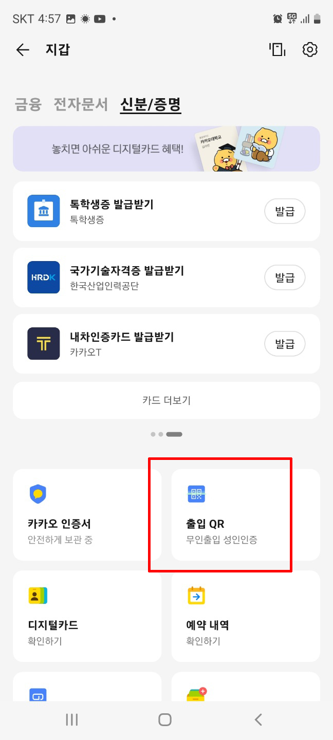 3) 상단에 "신분 / 증명" 클릭 하시면 → 아래쪽에 "출입 QR"을 선택해주시면 됩니다.