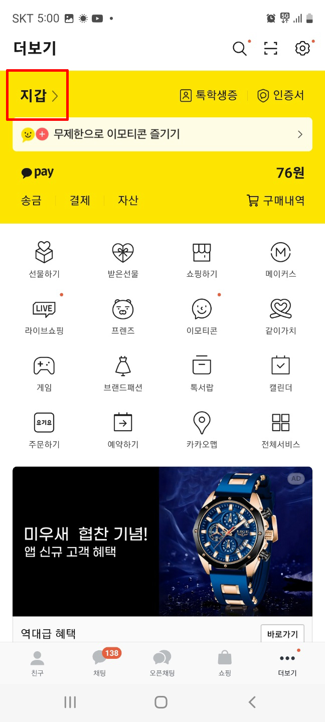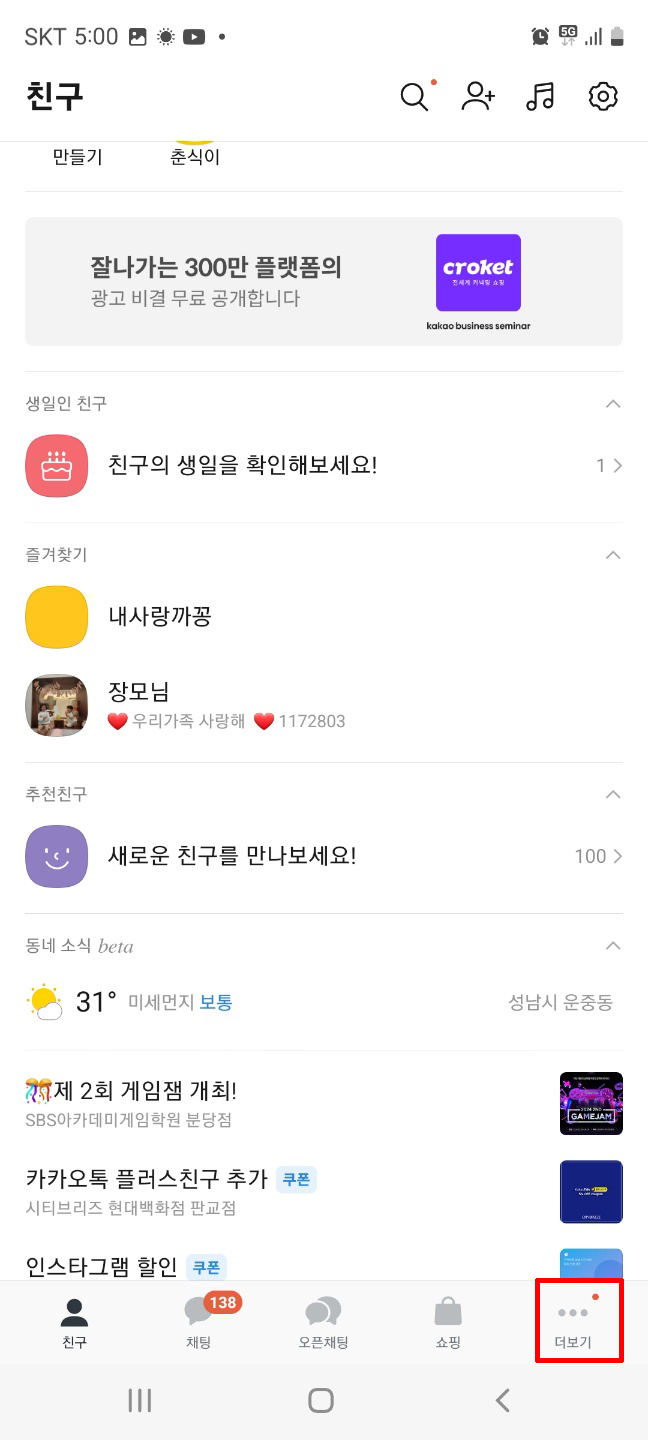 1) 카카오톡 들어가시면 아래 점 3개 "더 보기" 클릭하시면 됩니다.