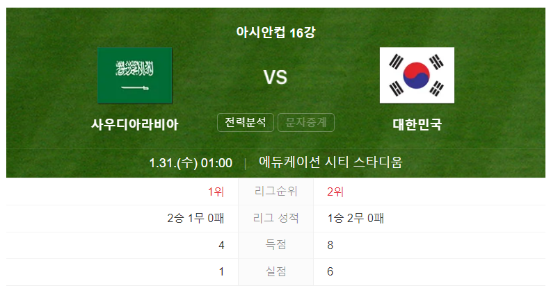승리를 기원하면 16강 경기인 사우디 아라비아의 전력과, 대한민국의 전력을 비교해보겠습니다.