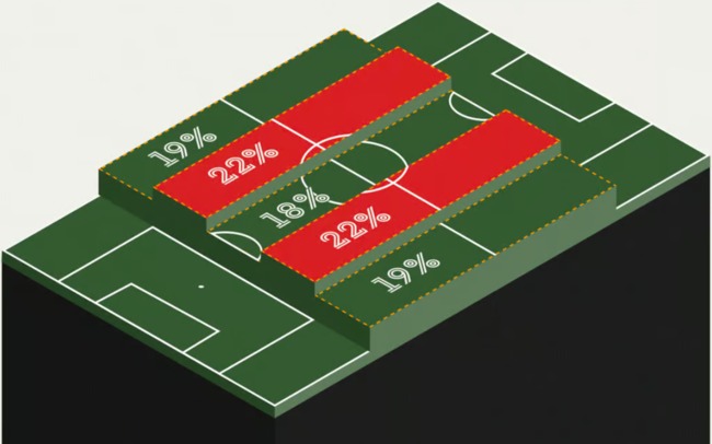 조별 예선 3경기를 분석해 보면 사우디는 발간색 부분의 하프스페이스를 적극 활용했습니다.