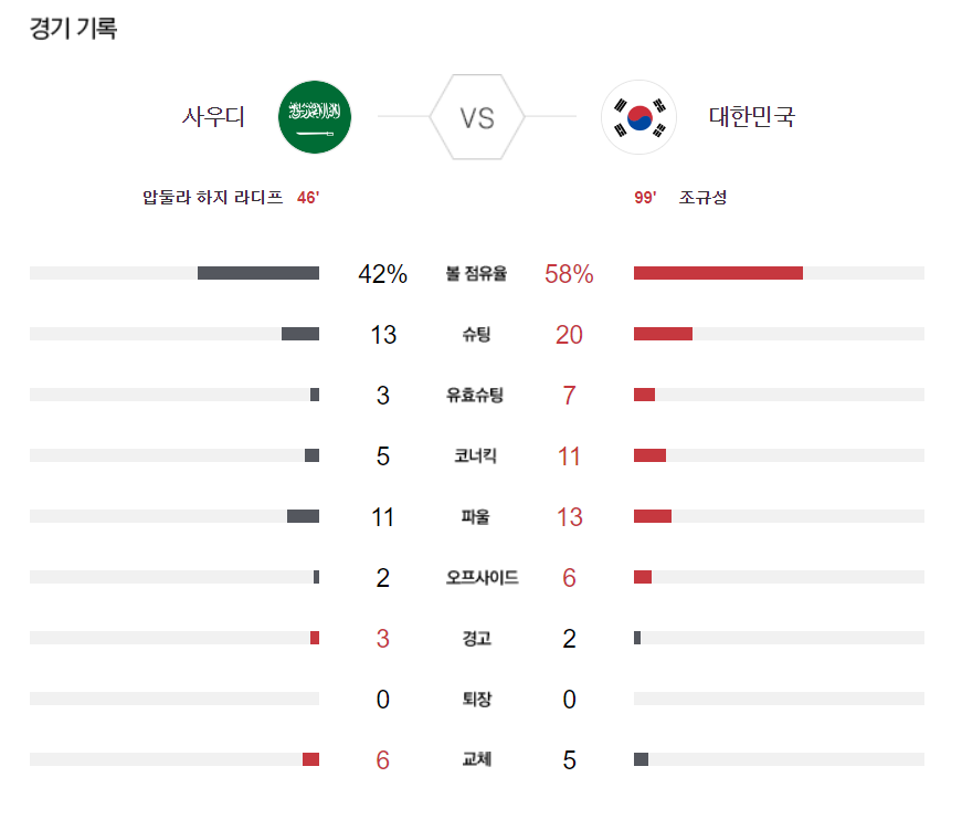 1-2. 대한민국 VS사우디아라비아 경기기록