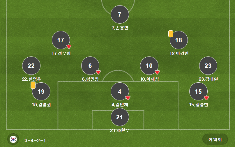 한 번도 사용하지 않았던 쓰리백을 카드를 커내며 김영권, 김민재, 정승현을 내세 었습니다.