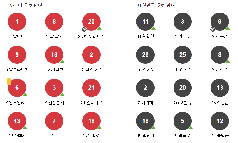 1-1. 대한민국 VS사우디아라비가 16강전 선발 라인업