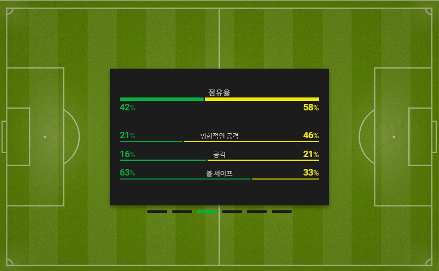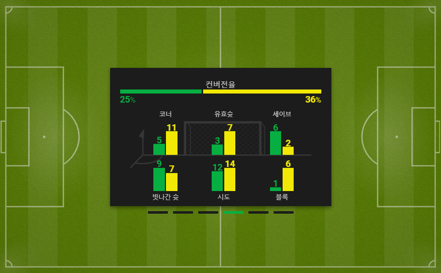 슈팅 숫자와 유효슈팅에서 보듯이 골 결정력에 아쉬움이 남아 있습니다.