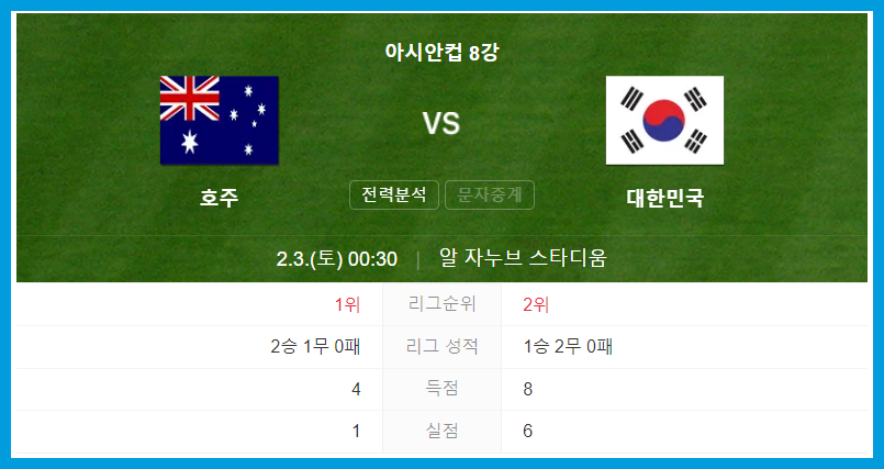 지난 16강 간단한 정리와 대한민국 VS호주와의 8강 일정 및 전력 비교를 해보겠습니다.
