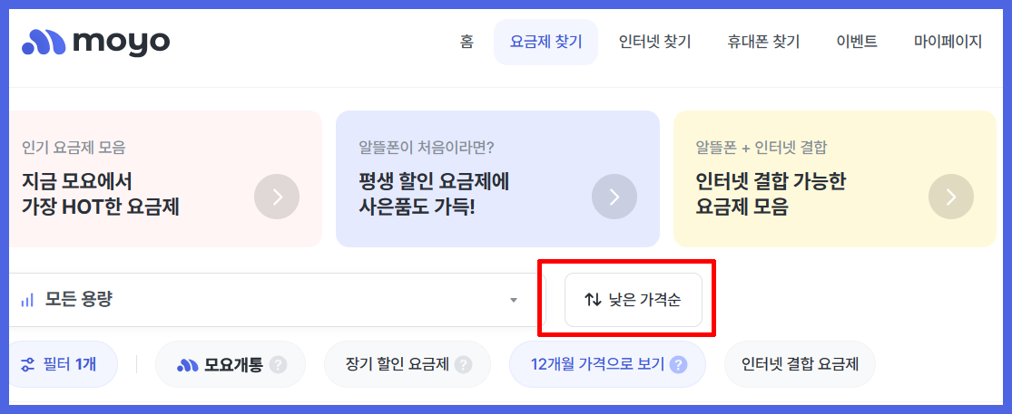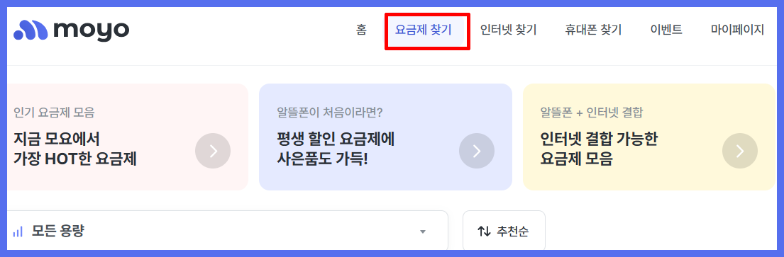 3. 요금제를 찾으실 때 추천순이 아닌 낮은 가격 순으로 정렬 후 찾아보시길 권해 드립니다.