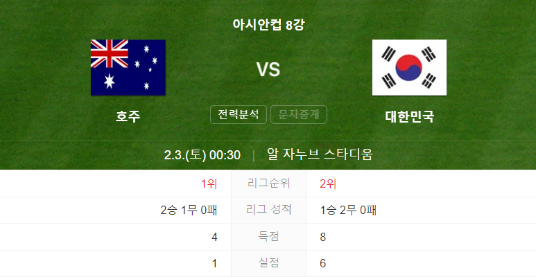 대한민국 VS호주는 돌아오는 토요일 새벽 2월 3일 00:30분입니다.