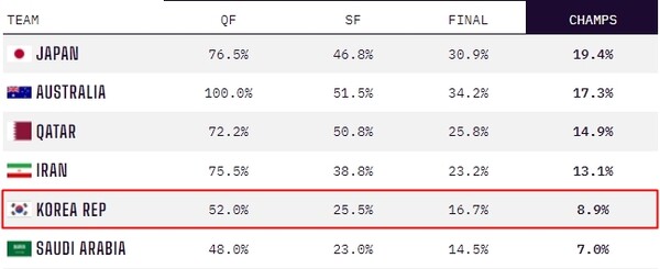 데이터상의 우승 확률은 대한민국의 2배나 높은 승률입니다.